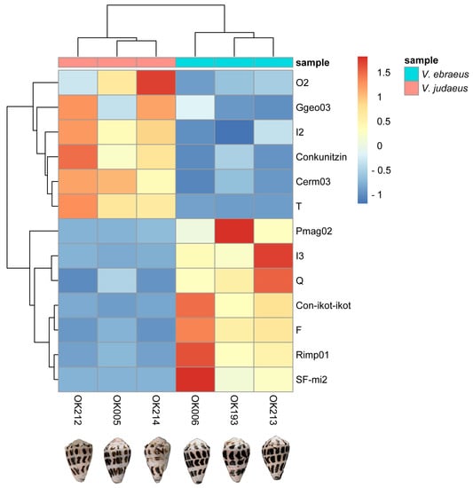 Clean reads from trimmomatic were aligned to the cds of conotoxin precursors and hormones using the pseudo-aligner Kallisto v0.46.0 []. Raw estimated counts of each transcript belonging to the same superfamily were added up to create a matrix (Supplementary Table S2). Superfamilies that had 0 counts in any of the samples were not included in the expression analysis. EBSeq [] was used to estimate differential expression between V. ebraeus and V. judaeus using each of the samples as a biological replicate. A superfamily was considered differentially expressed when the posterior probability (PPDE) was ≥0.95. Heatmaps with the differentially expressed superfamilies were based on transcripts per million (TPMs) mapped by Kallisto and plotted using the R package pheatmap (https://cran.r-project.org/web/packages/pheatmap/index.html, accessed on 15 May 2021) with the Z-score (number of standard deviations, respect to the mean between the values of each superfamily) to normalize data.