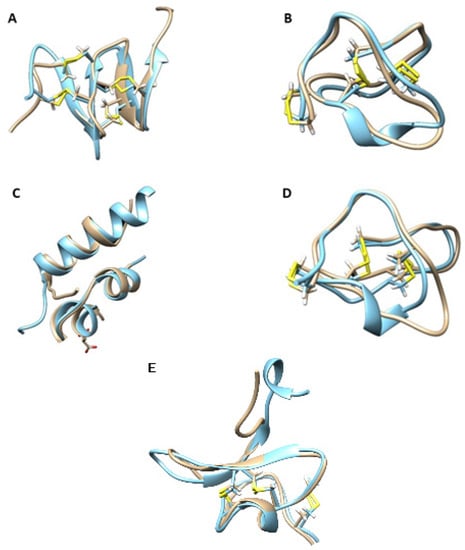 Determination of the 3D structures of relevant venom proteins. Superimposition of the AlphaFold2 model (blue) with known structures (beige). (A) OK006_E_244_Sf-mi2 and Rhizoconus miles conotoxin ϕ-MiXXVIIA (PDB 6ppc) []; (B) OK193_E_124_O1 and Pionoconus magus ω-conotoxin MVIIA (Ziconotide; PDB 1ttk) []; (C) OK213_E_290 and Gastridium geographus insulin G1 (PDB 5jyq) [,]; (D) OK160 Eb6.9_O1 and G. geographus ω-conotoxin GVIA (PDB 1omc) []; and (E) Cebr033_J_232_Virro03 and μ-theraphotoxin-Pn3a isolated from venom of the tarantula Pamphobeteus nigricolor (PDB 5t4r) [].