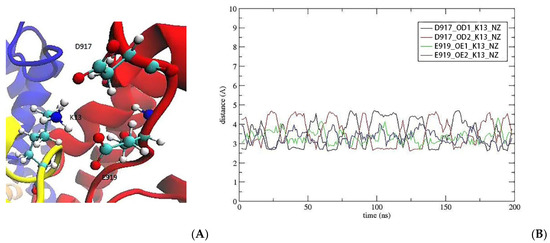 K13 provides a perfect fit for the interaction of K13 with both D917 and E919. (A) After the mutation, K13 forms ionic bonds with D917 and E919. (B) The time series of the contact distances between K13 and D917/E919.