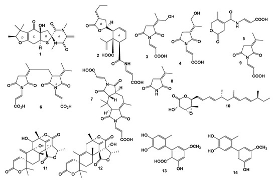 Chemical structures of 1–14.