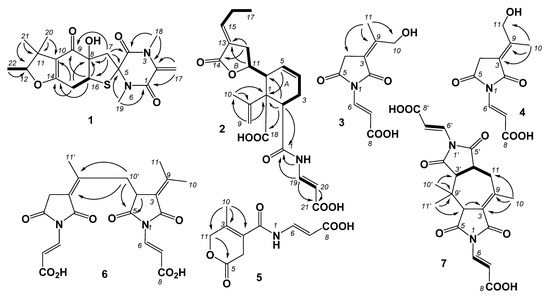 Key COSY (bold lines) and HMBC (arrows) correlations in 1–7.