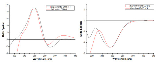 Calculated and experimental electronic circular dichroism (ECD) spectra of 1 and 2.