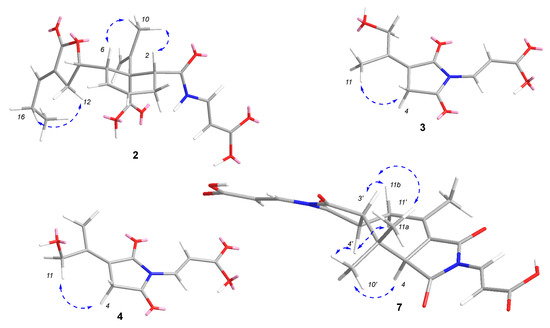 Compound 3 was isolated as a colorless powder. The molecular formula of 3 was determined to be C10H11NO5 based on the HRESIMS spectrum (m/z [M + H]+ 226.0716, calcd for C10H12NO5, 226.0710), accounting for six degrees of unsaturation (Figure S15). The 1H and 13C NMR spectra, along with HSQC data (Figures S16–S18, Table 2), revealed the presence of one trans-double bond (δH 7.55 (d, J = 14.5 Hz)/δC 131.3 (C-6); 6.73 (d, J = 14.5 Hz)/δC 109.2 (C-7)), one sp3 methylene (δH 3.40/δC 33.6 (C-4)), one sp3 oxygenated methylene (δH 4.66/δC 60.0 (C-10)), one methyl group (δH 1.91/δC 18.1 (C-11)), two sp2 quaternary carbons (δC 117.8 (C-3); 156.2 (C-9)), and three carbonyls (δC 166.5 (C-2), 172.5 (C-5), 167.8 (C-8)). The NMR data were similar to those of (E)-3-(2,5-dioxo-3-(propan-2-ylidene) pyrrolidin-1-yl)acrylic acid [15], although one of the methyl groups was replaced by a hydroxymethyl in 3. The hydroxyl of C-10 was confirmed by the HMBC correlations (Figure 2 and Figure S19) between H3-11 and C-3, C-9, and C-10, and ROESY correlation (Figure 4 and Figure S20) between H3-11 and H2-4. Thus, the structure of 3 was determined and named 10-hydroxy-8-demethyltalaromydine.