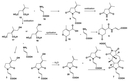 The biosynthesis of 2–9 most likely proceeds via the same precursors, and plausible biosynthetic relationships of 3–5 and 7–9 are presented in Figure 5. Precursors 15 and 16 may be derived from the tricarboxylic acid cycle [21] and then form 9 by an amidation reaction. Compound 8 is produced by the oxidization of 9. Compound 5 is proposed to be generated after the oxidization, cyclization, and amidation of 15 or 16. Compound 7 is proposed to be derived from the cyclization of 9 and dehydration of 4.