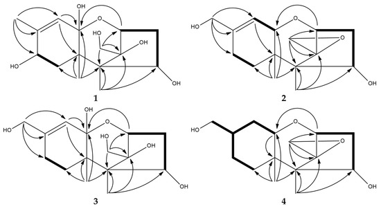 Compound 4 was obtained as a colorless gum with elemental formula of C15H24O4 determined by 13C NMR and HRESIMS [M + H]+ at m/z 269.1743 (calcd. 269.1747) analysis. Combination of IR, 1H (Table 1), 13C NMR (Table 2), and HMBC (Figure 2) spectrum data confirmed that compound 4 was almost similar to compound 7, indicating that 4 possessed an identical skeleton to that of 7 except for acetoxy group signal in 7 replaced by a hydroxy in C-2; these results, together with the appearance of the oxymethine carbons (C-4, δC 72.3) in 4, were much more upfield than that in 7. The COSY spectrum data supported these results, in that the correlations of H-9 (δH 1.75) to Hab-16 (δH 3.74 and 3.47), Hab-10 (δH 1.92 and 1.59), and Hab-8 (δH 1.70 and 1.64); Hab-8 to Hab-7 (δH 1.98 and 1.17); Hab-10 to H-11 (3.39). The NOESY correlation peaks of compound 4 were similar to those of compound 7, which is also a tricothecene-based compound [12].
