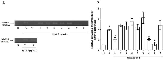 Gelatinolytic activity of MMP-9 in S1 protein-stimulated THP-1 monocytes. Zymogram shows the different activity of MMP-9 upon treatment of THP-1 monocytes with the different compounds (A). The relative quantification of gelatinase MMP-9 is reported in (B). R: resting (condition with no stimulation); V: vehicle (DMSO) with S1 protein THP-1 monocytes cells. Data represent means ± S.D. # p < 0.01 compared with the resting; * p < 0.05 compared with the vehicle.
