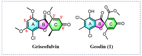 The structures of griseofulvin and geodin (1) which share the same grisan backbone (rings A, B and C).