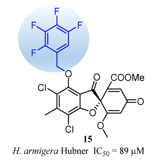 In this study, the insecticidal activities against Helicoverpa armigera Hübner of geodin (1) and 36 new derivatives modified at the 4-OH position were assessed. Most derivatives showed better insecticidal activity than marine natural product 1 (Table 2). Most of the derivatives were functionalized with benzyl analogues except for 37 which was modified with only an ethyl group and had no insecticidal activity. Compounds 2–4 and 35 were modified with bromobenzyl moieties and exhibited moderate insecticidal activity with IC50 values of 176 μM (although 4 was inactive). In addition, the introduction of chlorobenzyl groups at the 4-OH position of 1 afforded the analogues 5–9 and 31–34 most of which showed higher insecticidal activity. However, the 2-chlorobenzyl derivative 5, 2-chloro-4-fluorobenzyl derivative 31 and 4-chloro-2-fluorobenzyl derivative 33 displayed lower activity against H. armigera Hübner compared to parent 1. Besides, the iodobenzyl analogues 10 and 11 had no insecticidal activity. Multiple studies have demonstrated that the introduction of a fluorine atom was useful for increasing insecticidal activity because of its unique properties such as electronegativity, size, and electrostatic interactions [21,22,23,24,25]. Herein, 12–21 were modified by fluorinated benzyl and most exhibited stronger activity (16 and 19 were inactive). Especially, 2,3,4,5-tetrafluorobenzyl derivative 15 exhibited potent insecticidal activity comparable with the positive control azadirachtin with an IC50 value of 89 μM (Figure 2). Moreover, the result of the antifouling activity of 15 against Navicula exigua and the settlement of the Mytilus edulis showed inactive and indicated 15 was non-toxic. In addition, non-halogenated benzyl derivatives 22–30 which were modified with nitro, methyl, phenyl and nitrile groups had good insecticidal activity except for 3-methylbenzyl compound 24 and 2-cyanobenzyl compound 30. The above results indicated that the introduction of benzyl especially halogenated benzyl could enhance the insecticidal activity of 1. Strikingly, further research on 15 was worth developing the low-toxicity and high-efficiency insecticide drug.