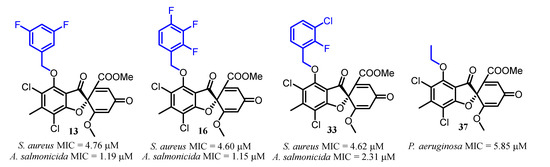 Interestingly, the ethyl derivative 37 showed selective inhibitory activity against P. aeruginosa with an MIC value of 5.85 μM and the positive control Sea-Nine 211 had an MIC value of 0.27 μM (Figure 3). The results revealed that the halogenated benzyl modification on 4-OH of geodin (1) improved the antibacterial activity against S. aureus and A. salmonicida. At the same time, the introduction of ethyl on the 4-OH position of geodin showed selective inhibitory activities against P. aeruginosa.