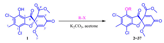 The chemical structure of 1 was elucidated by analysis of NMR data and comparisons with literature [17]. Compound 1 contains an exchangeable proton, two singlet protons, two oxygenated methyl groups and a methyl. The substituents at the 4-OH were semisynthetically modified (Scheme 1) using benzyl bromide at a temperature of 40 °C for 6–12 h in the presence of K2CO3 in dry acetone to produce compounds 2–37 (Figure 1 and Table 1). The structures of these derivatives (2–37) were fully characterized by extensive spectroscopic analyses (Figures S1–S111).
