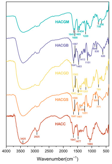 The FT-IR spectra of HACC, HACGM, HACGB, HACGD, and HACGS are shown in Figure 1. The absorption peaks of HACC appeared in 3425 cm−1 (O-H and N-H stretching vibration), 2925 cm−1 (C-H of sugar rings), and 1647 cm−1 (C=O of amide bond), and the absorption peak of the trimethylammonium group appeared at 1477 cm−1 after quaternization of chitosan [37]. For HACGM, HACGB, HACGD, and HACGS, a new absorption peak, different from HACC, appeared near 1640 cm−1 with moderate intensity and was attributed to the C=N stretching vibration peak of the Schiff bases. Additionally, there a new peak appeared at about 1460 cm−1, which was assigned to the absorption peak of the trimethylammonium group. The asymmetric stretching vibration and symmetric stretching vibration peaks of carboxyl group appeared approximately at 1600 cm−1 and 1400 cm−1, respectively. In addition, For HACGM, the stretching vibration of Ar-O-C appeared at 1220 cm−1. For HACGB, the C-Br stretching vibration strong absorption peak showed at 620 cm−1. For HACGD, the C-Cl stretching vibration strong absorption peak showed at 769 cm−1. The further structural data of those compounds were interpreted by 1H NMR [38,39,40].