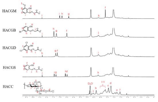 As shown in Figure 2, in the spectrum of hydrogen atoms located in the HACC frame, there was an obvious characteristic absorption of hydrogen (3.10 ppm) of trimethylammonium groups [41]. The absorption of hydrogen atoms in the benzene ring of HACC derivatives was labeled in graphs. Those hydrogen atoms located in the compound imine showed absorptions at around 8.30 ppm; hydrogen atoms connected with carboxyl-bonded carbon atoms showed absorptions around 4.15 ppm [42]. Information about the other hydrogens is as follows: