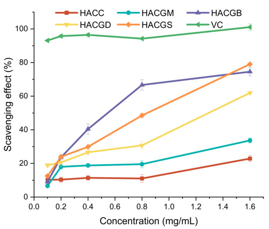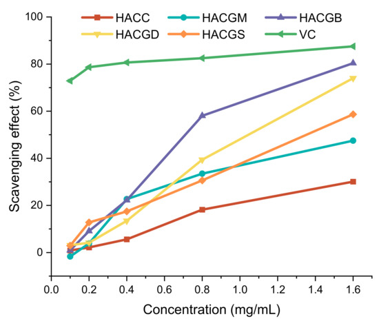 In the metabolism of living organisms, oxygen in cells can produce reactive oxygen species (ROS) in mitochondria, including superoxide anion (O2−), hydrogen peroxide (H2O2), hydroxyl radical (OH−), ozone (O3), and singlet oxygen (1O2) [43]. They have high chemical reaction activity because of unpaired electrons. One of the electron products of oxygen, in particular, superoxide anion (O2−), has strong oxidation and reduction ability. When large quantities of O2− accumulate in the human body, they can destroy cell membranes and harm tissue metabolism. As can be seen from Figure 3, after modification, the superoxide radical-scavenging capacity of the compounds was improved, especially for HACGB, whose scavenging ability reached 80.32% at the concentration of 1.6 mg/mL, followed by HACGD, which reached 74.01%. With the increase of concentration, the scavenging ability gradually showed a certain trend: HACGB > HACGD > HACGS > HACGM > HACC.