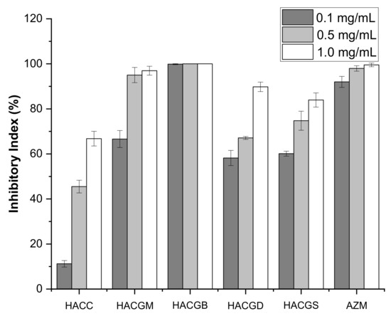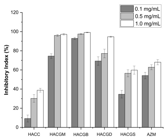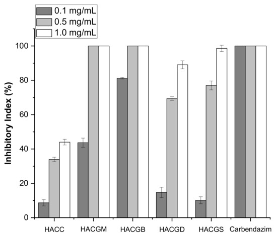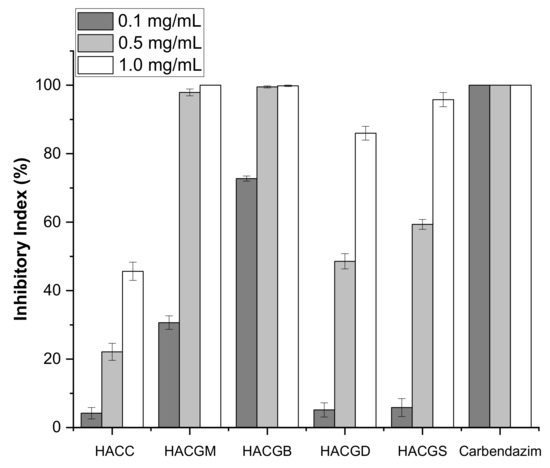Infecting through multiple pathways, B. cinerea, the fungi requiring loose condition to grow, could easily cause plant decay and large-scale crop loss [46]. Therefore, it is of great significance to prepare good bacteriostatic agents. The inhibitory effects of four newly synthesized compounds on B. cinerea were determined by mycelium growth rate method. The results showed that all the four compounds had the ability to inhibit B. cinerea growth in a concentration-dependent manner. In particular, the antifungal ability of HACGM and HACGB achieved 100%, which was far more than HACC at the concentrations of 0.5 mg/mL and 1.0 mg/mL. Through Figure 7, it was clear that the sequencing of antifungal ability was HACGB > HACGM > HACGS > HACGD > HACC.