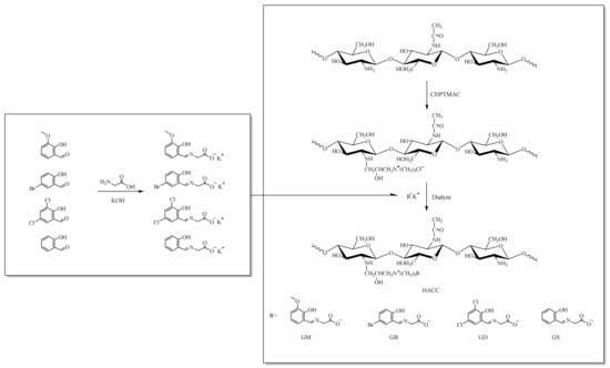 In recent years there have been significant advances in chitosan derivatives [13,14,15]. The synthesis and application of N-2-Hydroxypropyltrimethyl ammonium chloride chitosan (HACC) is a good example. HACC is synthesized by a reaction of chitosan and 3-chloro-2-hydroxypropyl trimethyl ammonium chloride (CHPTMAC) or glycidyl trimethylammonium chloride (GTMAC) [16,17]. Because of its good water solubility, safety, and non-toxicity, various applications of HACC and its derivatives have been studied such as delivery vehicles for live, attenuated vaccine, DNA vaccine, and inactivated vaccine [18,19,20]; adsorbents used to remove reactive dye or impurity ions from aqueous solutions [21,22]; inhibitor on mild steel [23]; and straw paper for antibacterial food-packaging [24]. However, most of the experimental data showed that the antimicrobial and antioxidant activities of HACC needed to be improved [25,26].