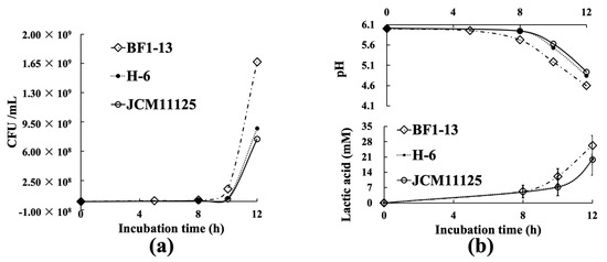Comparison of each strain (BF1-13 ↓, H-6 λ, JCM11125 ϒ) on various characteristics. (a) The growth curve of the three strains. (b) The amounts of LA and pH changing of each strain during 12 h incubation. Data are shown as means ± SD, n = 9.