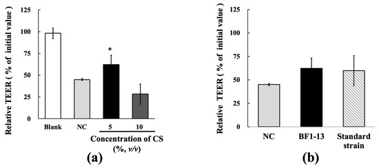 TcTEER values decreased to 45.1% of the initial values after 6 h H2O2 treatment on the intestinal epithelial model using Caco-2 cells. The decreasing tcTEER value by H2O2 treatment was suppressed by the supplementation of 5% (v/v) CS of strain BF1-13. At the same supplemented concentration of 5% (v/v) of the CSs, strain BF1-13 (62.2%) showed slightly higher TEER values than standard strain (59.9%) (Figure 2b). However, this effect of the CS of strain BF1-13 disappeared by the 10% (v/v) supplementation (28.3%). (Figure 2a).