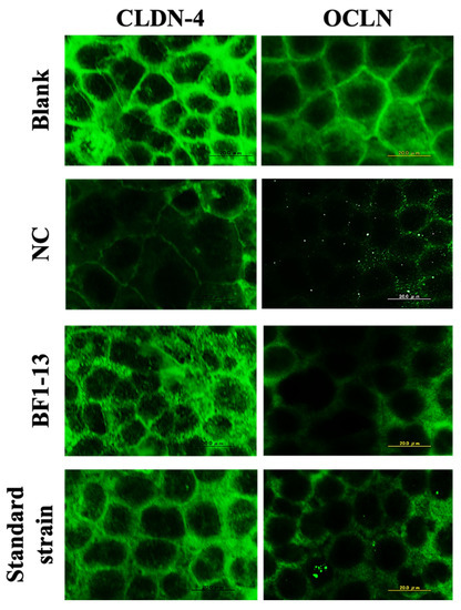Decreasing expression of CLDN-4 by H2O2 treatment was inhibited by the supplementation of the CS of the strain BF1-13. This effect was also shown on the standard strain (Figure 3). However, the expression of OCLN was different from that of CLDN-4. There was a little difference between the metabolites of the two strains. In the case of strain BF1-13, the difference of the effects between supplemented concentration 5% and 10% was barely seen with the immunofluorescent staining microscopy (Data not shown.)