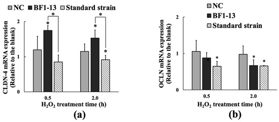 The inducement of the metabolites of the strain BF1-13 (black) on the expression of CLDN-4 (a) at the transcription level compared with the standard strain (slashes), which was compared with the expression of OCLN (b). Monolayers were preincubated with 5% (v/v) CS of the two strains separately or without (NC) for 2 h, followed by 1 mM H2O2 treatment for 0.5 and 2 h separately or not (blank). The mRNA expressions relative to the blank are shown as means ± SD, n = 3. Asterisks indicate a significant difference with the blank, or between BF1-13 and the standard strain (* p < 0.05) determined by the Mann–Whitney U test.