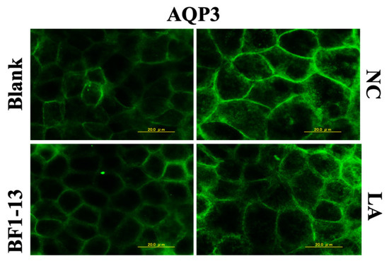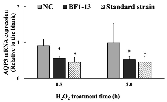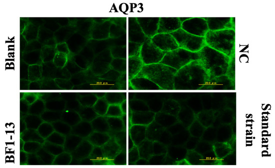 The expression of AQP3 was enhanced by 1 mM H2O2 treatment compared to the blank, which was also supported by the previous report [10]. The AQP3 expression was suppressed by the supplementation with the CS of strain BF1-13. Then, the same effect was shown in the CS of the standard strain (Figure 5).