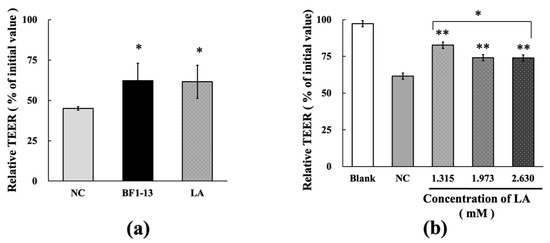Equal concentration of authentic LA (1.32 mM), which was contained in the metabolites, included in the 5% (v/v) CS of strain BF1-13 indicated almost the same protective effect on decreasing TEER by H2O2 treatment on the model (Figure 7a). Supplementation of authentic LA (1.32, 1.97, and 2.63 mM) suggested the significant maintenance effect of relative TEER values (83%, 74%, 74%) on the model treated with H2O2 (Figure 7b). However, the protective effect of LA decreased by the higher concentration, which was more than 1.32 mM.