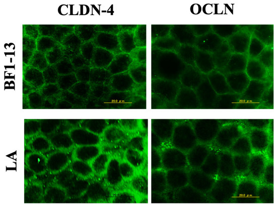The comparison of the enhancements between the metabolites of strain BF1-13 and LA on the expression of CLDN-4 and OCLN. Monolayers were preincubated with 5% (v/v) CS of the strain and LA (1.32 mM) separately for 2 h, followed by 1 mM H2O2 treatment for 2 h. Images were observed by fluorescence microscopy. Each image is representative of 3 similar experiments. The scale bar is 20 µm.