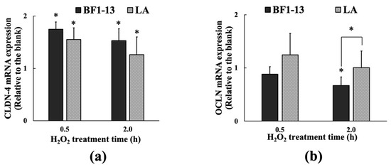 The CLDN-4 expression was maintained by the supplementation of the CS of strain BF1-13 and the equal concentration of authentic LA against H2O2 treatment (Figure 8). There was little difference in the effect between them. However, in the case of the equal concentration of authentic LA contained in the metabolites, the suppression of OCLN expression by the H2O2 treatment was relieved.