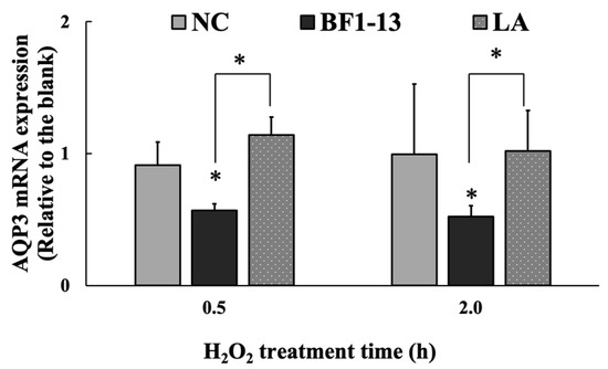 The effect of the metabolites of strain BF1-3 (black) and equal concentration of authentic LA (spots) on the expression of AQP3 at the transcription level. Monolayers were preincubated with 5% (v/v) CS of the strain BF1-13 and LA (1.32 mM) separately or without (NC) for 2 h, followed by 1 mM H2O2 treatment for 0.5 and 2 h separately or not (blank). The mRNA expressions relative to the blank are shown as means ± SD, n = 3. Asterisks indicate a significant difference with the blank, or between BF1-13 and LA (* p < 0.05) determined by the U-Mann-Whitney test.