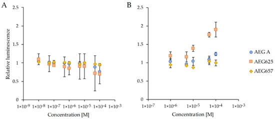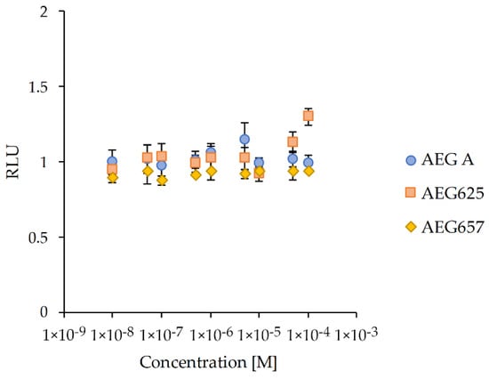 Luciferase assay response curves for Huh7 reporter cells exposed for 24 to increasing concentrations of the three AEGs. Relative luciferase activity was calculated using the ratio of firefly (F) and Renilla (R) luciferase activity (F/R) and was expressed in relative luminescence units (RLU). All assays were performed in triplicate in a 96-well format and were normalized to luciferase expression of cells treated only with the transfection reagent. Data are expressed as means with a standard deviation.