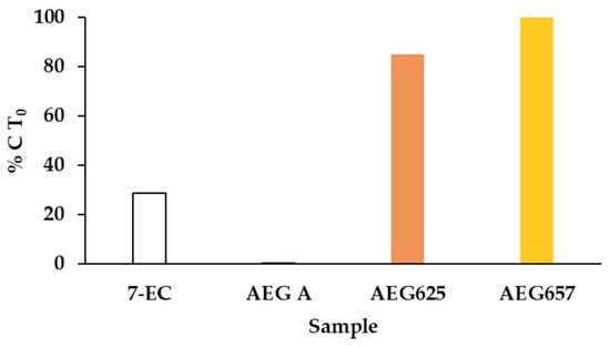 Concentrations of 7-EC, AEG A, AEG625, and AEG657 after 60 min exposure to S9 fraction containing microsomal and cytosolic enzymes. Results are expressed in relation to initial concentration of the compounds (%C T0).