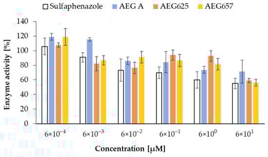 Effects of AEG A, AEG625, and AEG657, applied at different concentrations, on activity of CYP2C9 human P450 enzyme (after 60 min incubation). Data are expressed as means with a standard deviation.
