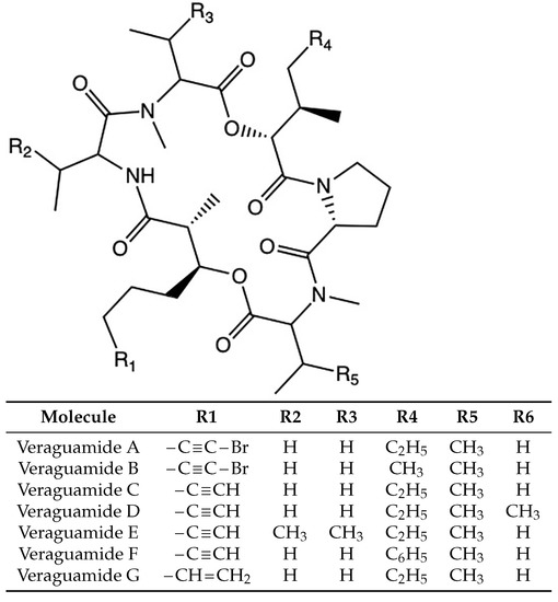 Two-dimensional representations of the molecular structures of the Veraguamides A–G family of marine cyclic hexadepsipeptides.