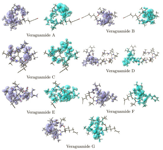 Graphical representation of the dual descriptor DD of the Veraguamide A, Veraguamide B, Veraguamide C, Veraguamide D, Veraguamide E, Veraguamide F and Veraguamide G molecules. Left: DD > 0, Right: DD < 0.