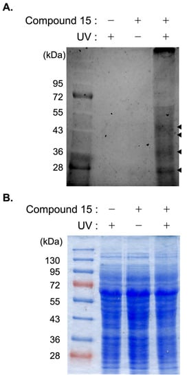 Compound 15 (50 nmol) was added to 1 mg/mL of lysate, and the mixture was incubated at 4 °C for 1 h. After UV irradiation (365 nm) for 10 min on ice, 150 µL of portion was mixed with 600 µL of cold acetone to precipitate the protein in lysate. After centrifugation (15,000× g, 60 min), the precipitant was mixed with 1× SDS sample buffer and subjected to SDS-PAGE. Based on the fluorescence of compound 15 (Ex 505 nm, Em 555 nm), compound-15-labeled proteins were detected by an Image Quant LAS4010 Scanner (GE Healthcare Life Sciences, Buckinghamshire, UK). To detect whole proteins, the gel was stained by Coomassie Brilliant Blue (CBB).