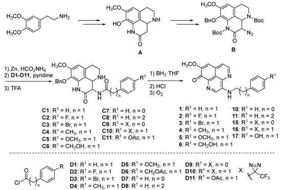 First, we conducted the synthesis of PDOA analogues by modifying its side chain. Previously, we had accomplished the total synthesis of 1, the outline of which is depicted in Scheme 1 [8]. Starting with a known tricyclic intermediate A [11], an azide group was installed at C-3 position of A to produce an intermediate B. Then, the phenethylamino side chain was attached through reduction of the azide group and subsequent acylation using acyl chloride D1 (intermediate C1: R1 = H, n = 1); the final one-pot sequential transformations, i.e., reduction of amide moieties by BH3/hydrolysis of the resulting amine-borane complex/oxidative aromatization using O2, produced the desired compound 1. Applying the above synthetic method with the corresponding acyl chlorides D2–D8, we could prepare the objective PDOA analogues (2–6, 10, 11) (Figures S1–S14). Compounds 15 and 16, having a trifluoromethyl diazirine group for the photoaffinity labeling of the target protein, were also synthesized in the same manner as above (Figures S15–S18).
