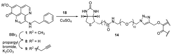 Another biotinylated probe 14 was synthesized through the modification of substituent R2 of 1 (Scheme 3). The cleavage of the methyl ether at C-8 position of 1 using BBr3 produced the 8-OH analogue 8 (Figures S25 and S26). The subsequent propargylation and Huisgen reaction with PEG-tethered biotin 12 produced the desired probe molecule 14 (Figure S29).