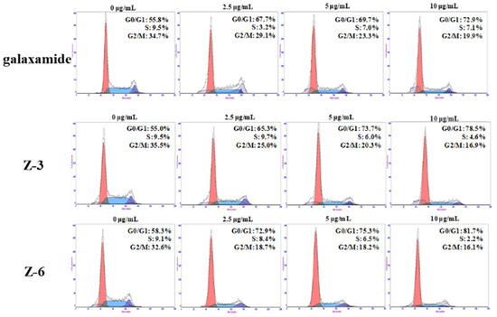 Compounds Z-3 and Z-6 exhibited better inhibition effects on the growth of all cancer cell lines than the others, especially on that of MCF-7. Therefore, propidium iodide (PI) staining method was used to further investigate the changes in the cell cycle distribution of MCF-7. In particular, MCF-7 cells were exposed to galaxamide, Z-3, and Z-6 with concentrations of 0, 2.5, 5, and 10 µg/mL for 72 h. Generally, the main effects of galaxamide, Z-3, and Z-6 on MCF-7 cells were in the G0/G1 phase. There was no obvious sub diploid peak in flow cytometry. However, as the concentration increased, the number of cells in the G0/G1 phase also gradually increased. Hence, the effects of galaxamide, Z-3, and Z-6 on MCF-7 cells mainly blocked the growth of cells in the G0/G1 phase (Figure 3).