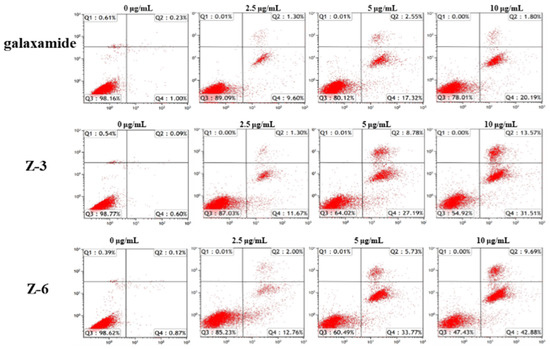 The Annexin V-FITC/PI double staining method was used to analyze the changes in the apoptosis of MCF-7 cells after 72 h of galaxamide, Z-3, and Z-6 exposure. The results showed that the apoptosis rate of MCF-7 increased with the increasing of the concentration after 72 h of incubation. At low concentrations, the effects of all the tested compounds were not obvious. When the concentration reached 10 μg/mL, the apoptotic effects of galaxamide, Z-3, and Z-6 on MCF-7 cells were more obvious in the late apoptotic state. Particularly, the apoptotic effects of Z-3 and Z-6 on MCF-7 cells were significantly higher than those of galaxamide (Figure 4).