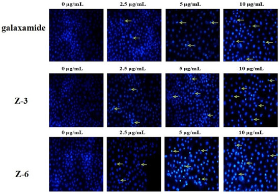 The morphological alteration of MCF-7 cells was analyzed by the method of Hoechst 33,342 staining (Figure 5). After the MCF-7 cell line was treated with galaxamide, Z-3, and Z-6 for 72 h, the morphology of the nuclei was significantly changed. The pyknotic nuclei increased with the increasing concentration of these compounds. At the same time, karyorrhexis and karyolysis were observed, indicating that these compounds could cause obvious cell apoptosis.