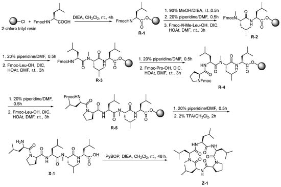 3.2.10. Synthesis of Cyclo (Leu-N-Me-Leu-Leu-Pro-Leu) (Z-1)