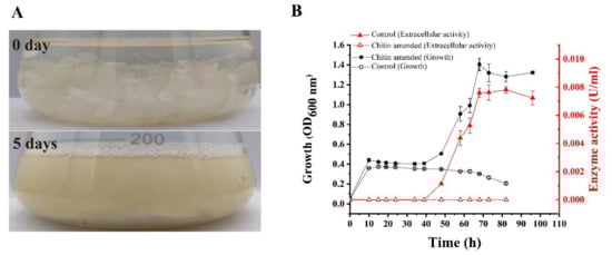 Growth and extracellular chitinase activity of P. flavipulchra DSM 14401T cultured on crystalline chitin. (A) Cultures of strain DSM 14401 at 25 °C for 0 and 5 days. (B) The growth curve (black line) and the extracellular chitinase activity (red line) of strain DSM 14401. Strain DSM 14401 was cultured in a minimal medium containing 0.05% peptone, 0.01% yeast powder, and 3% (w/v) chitin flakes at 25 °C and 180 rpm. The extracellular chitinase activity was measured with chitin powder as the substrate at 50 °C. Strain DSM 14401 cultured in the same medium without chitin flakes and under the same conditions was used as the control.
