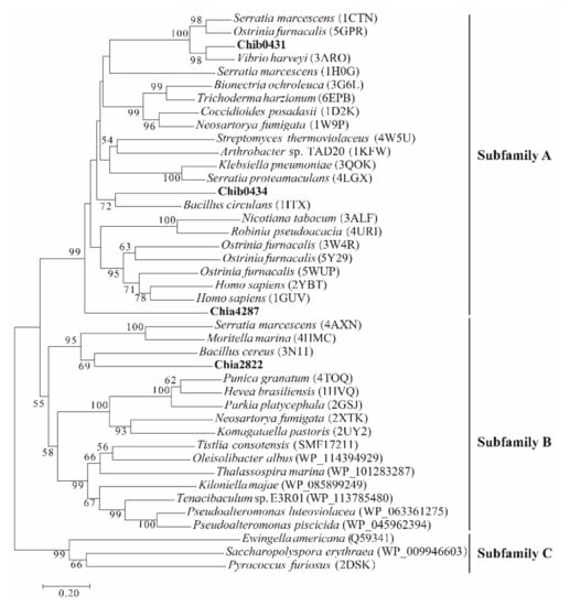 Phylogenetic analysis of chitinases Chib0431, Chib0434, Chia4287, and Chia2822 with other GH18 chitinases. The phylogenetic tree was constructed by the Neighbor-Joining method. Bootstrap analysis of 1000 replicates was conducted.