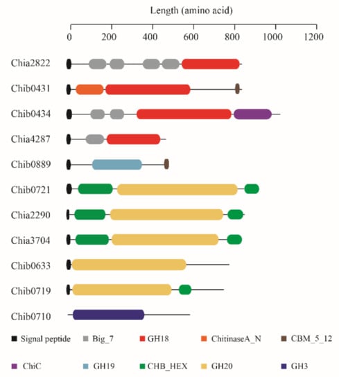 To ascertain the chitinolytic enzymes secreted by strain DSM 14401, genomic analysis was carried out to find putative chitinolytic enzyme-encoding genes in strain DSM 14401. There are 11 genes encoding putative chitinolytic enzymes in strain DSM 14401, which were named Chia2822, Chib0431, Chib0434, Chia4287, Chib0889, Chib0721, Chia2290, Chia3704, Chib0633, Chib0719 and Chib0710. Chia2822, Chib0431, Chib0434, and Chia4287 are potential chitinases belonging to the GH18 family (Figure 2). Of these, Chib0431, Chib0434, and Chia4287 belong to the GH18A subfamily that mainly contains processive exochitinases [,,], and Chia2822 belongs to the GH18B subfamily that mainly contains non-processive endochitinases [,]. Multiple sequence alignments suggest that all these GH18 chitinases of strain DSM 14401 contain a DxDxE catalytic motif (Figure S1), which is conserved in the GH18 chitinases []. Chitinase Chib0889 belongs to the GH19 family that mainly contains chitinases found in plants []. Two GH19 chitinases, LYS177 and LYS188, from Pseudomonas Ef1 have been reported to have lysozyme activity and they are clustered with phage/prophage endolysins based on the phylogenetic analysis []. However, the GH19 chitinase, Chib0889, of strain DSM 14401 was nested in the cluster of chitinases from Proteobacteria (Figure S2), implying that Chib0889 may function as a chitinase rather than a lysozyme. Chib0721, Chia2290, Chia3704, Chib0633, and Chib0719 from the GH20 family, and Chib0710 from the GH3 family are potential β-N-acetylglucosaminidases. The predicted domain architectures of these chitinolytic enzymes are shown in Figure 3. Except for Chib0710, the other chitinolytic enzymes all have a signal peptide predicted by SignalP 5.0, implying that they are likely secreted enzymes. Among these enzymes, Chib0633 and Chib0710 are single-domain enzymes, while the others are all multi-domain enzymes containing one or more carbohydrate-binding domains (Big_7, CBM_5_12, and CHB_HEX) in addition to their catalytic domains. The CBMs (carbohydrate-binding modules) in chitinases were reported to facilitate enzyme movement along a chitin chain during processive action and to stimulate the substrate to decrystallize [,,,].