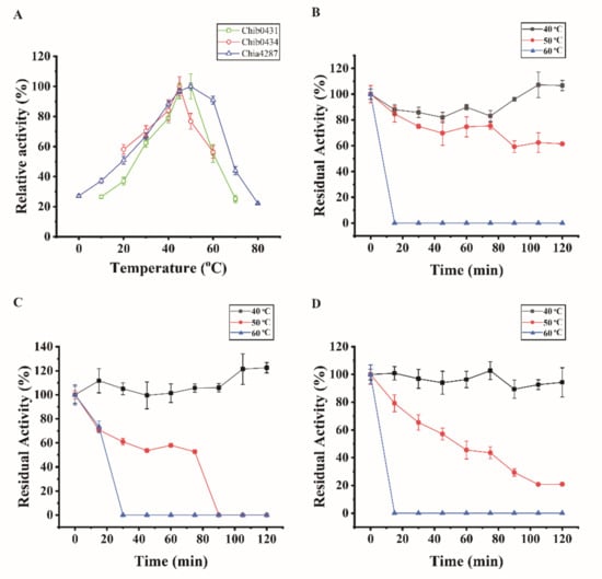 Effect of temperature on the activities and stabilities of chitinases Chib0431, Chib0434, and Chia4287. (A) Effect of temperature on the activities of Chib0431, Chib0434, and Chia4287. The activities of each enzyme were measured at its optimal pH with chitin powder as the substrate. The highest activity of each enzyme was defined as 100%. (B) Effect of temperature on the stability of Chib0431. (C) Effect of temperature on the stability of Chib0434. (D) Effect of temperature on the stability of Chia4287. In B, C, and D, the residual activities of each enzyme were measured at its optimal temperature and pH with chitin powder as the substrate, and the activity of each enzyme without incubation was defined as 100%. The graphs show data from triplicate experiments (mean ± SD).