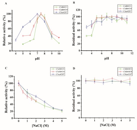 Effects of pH and NaCl on the activities and stabilities of chitinases Chib0431, Chib0434, and Chia4287. (A) Effect of pH on the activities of Chib0431, Chib0434, and Chia4287. The activities of each enzyme were measured at its optimal temperature with chitin powder as the substrate. The highest activity of each enzyme was defined as 100%. (B) Effect of pH on the stabilities of Chib0431, Chib0434, and Chia4287. The residual activities of each enzyme were measured at its optimal temperature and pH with chitin powder as the substrate. (C) Effect of NaCl concentration on the activities of Chib0431, Chib0434, and Chia4287. The activities of each enzyme were measured at its optimal temperature and pH with chitin powder as the substrate. The activity of each enzyme in 0 M NaCl was defined as 100%. (D) Effect of NaCl concentration on the stabilities of Chib0431, Chib0434, and Chia4287. The residual activities of each enzyme were measured at its optimal temperature and pH with chitin powder as the substrate. The highest activity of each enzyme was defined as 100%. The graphs show data from triplicate experiments (mean ± SD).