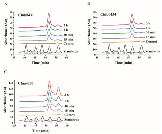 The purified Chib0431, Chib0434, and Chia4287 (10 μL) were incubated with 3.0% chitin powder in 190 μL of 50 mM Tris-HCl (pH 7.0) for different times (15 min, 30 min, 1 h, and 3 h) at their respective optimal temperatures. The reaction was terminated by boiling at 100 °C for 10 min, and the reaction mixtures were centrifuged at 17,949× g for 10 min. Then, the products in the supernatants were analyzed by gel filtration chromatography on a Superdex Peptide 10/300 GL column (GE Healthcare, Uppsala, Sweden), which were monitored at 210 nm using a UV detector. The injected volume was 10 μL. The products were eluted with 0.2 M ammonium hydrogen carbonate for 90 min with a flow rate of 0.3 mL/min. The reaction system containing 10 μL enzyme pre-heated at 100 °C for 10 min was used as the control. A mixture of GlcNAc, (GlcNAc)2, (GlcNAc)3, (GlcNAc)4, (GlcNAc)5, and (GlcNAc)6 was used as the marker.