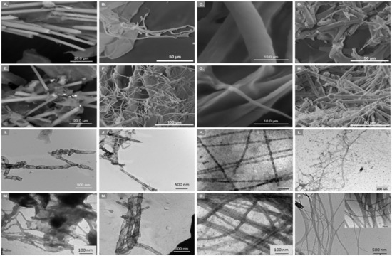 SEM micrographs of insoluble collagen (InSC; A,E), intercellular collagen (ICC; B,C,F,G), and spongin-like collagen (SlC; D,H) from Axinella cannabina (row 1) and Suberites carnosus (row 2), respectively. TEM micrographs of insoluble collagen before (InSC; I,M) and after (SF-InSC; J,N) spicule removal, intercellular collagen (ICC; K,O) and spongin-like collagen (SlC; L,P) from Axinella cannabina (row 3) and Suberites carnosus (row 4), respectively.