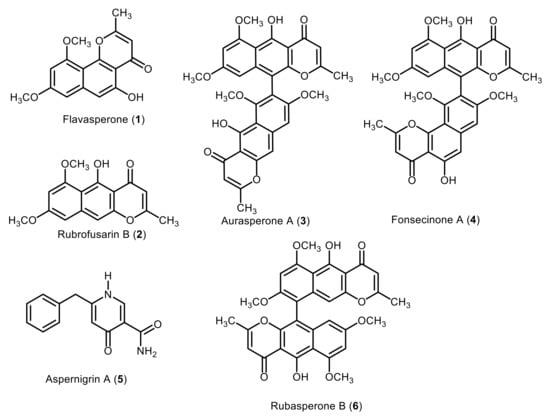 - Huang, H.-B.; Feng, X.-J.; Liu, L.; Chen, B.; Lu, Y.-J.; Ma, L.; She, Z.-G.; Lin, Y.-C. Three dimeric naphtho-γ-pyrones from the mangrove endophytic fungus Aspergillus tubingensis isolated from Pongamia pinnata. Planta Med. 2010, 76, 1888–1891. [Google Scholar] [CrossRef] [PubMed] [Green Version]