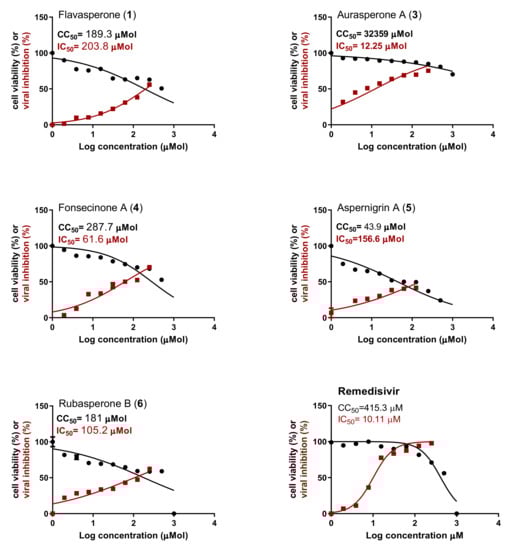 The antiviral activity of the isolated compounds was investigated using Vero E6 cells infected with SARS-CoV-2 virus (hCoV-19/Egypt/NRC-03/2020 (Accession Number on GSAID: EPI_ISL_430820)). Aurasperone A (3) showed the highest antiviral activity among the tested compounds (Figure 2). It showed potent antiviral activity against SARS-CoV-2 with IC50 = 12.25 µM that is comparable to the activity of the antiviral drug remdesivir (IC50 = 10.11 µM). Moreover, aurasperone A (3) was found to be safe to the Vero E6 cells with CC50 = 32.36 mM. It showed a selectivity index (SI = CC50/IC50= 2641.5) that is much higher than that of the positive control, remdesivir (SI = 41.07). These results indicate that aurasperone A could represent a promising antiviral candidate drug with lower side effects to the human than remdesivir. Fonsecinone A (4) showed medium antiviral activity against SARS-CoV-2 (IC50 = 61.06 µM) with SI = 4.7. The obtained results indicate that dimeric naphthopyrones shows better antiviral activity than the tested alkaloid (aspernigrin A, 5) and the monomeric naphthopyrone (flavasperone, 1). There was not enough amount of compound 2 (rubrofusarin B) to be tested in vitro. The obtained results also indicate that the type of connection between the two naphthopyrone units greatly affects their antiviral activity. The 10,7’ connected linear naphthopyrone (aurasperone A) showed higher activity than fonsecinone A and rubasperone B, with different types of connections.
