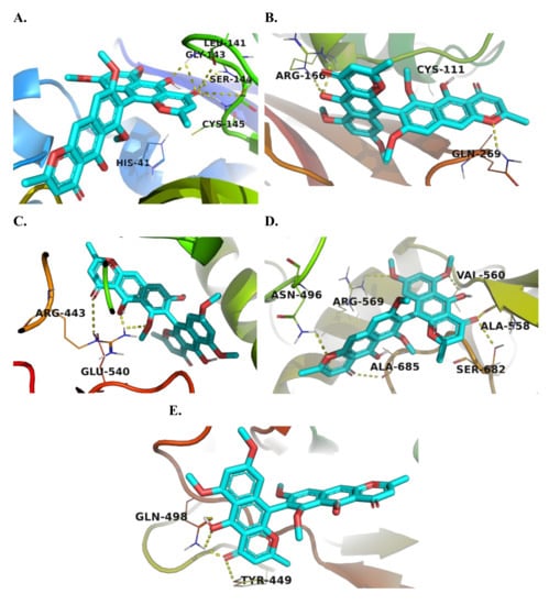 3D molecular model representation of the most active compound (aurasperone A (3)) binding within the active site of: (A) Mpro; (B) PLpro; (C) RNA helicase; (D) RdRp; (E) viral spike protein, showing the amino acid residues involved in the interaction.